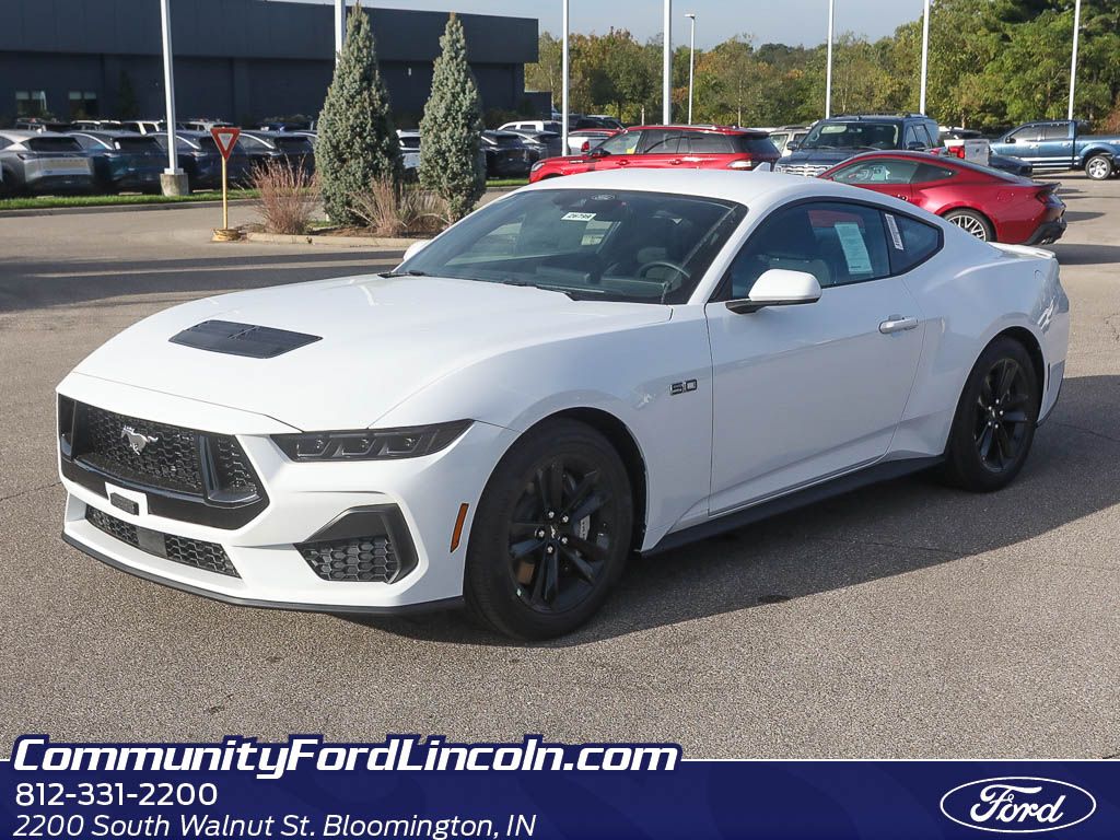 2025 Ford Mustang GT â" Bloomington IN. Powerful RWD performance meets modern convenience in this iconic V8 coupe. Under the hood sits a commanding 5.0L gasoline V8 that delivers exhilarating acceleration, signature Ford Mustang sound, and precise handling for spirited driving on highways and back roads alike. This Ford Mustang GT is loaded with driver-focused tech: Remote Start for comfort in any weather, seamless Android Auto smartphone integration for navigation and media, and Automatic Climate Control to keep every drive perfectly comfortable. Parking and maneuvering are easy with Rear Parking Sensors and a Back-Up Camera, adding confidence and safety to daily use. The sporty interior and sculpted exterior present a striking presence while offering practical features that enhance everyday usability. Whether youâre seeking weekend thrills or a reliable daily driver, this 2025 Ford Mustang GT blends performance, style, and convenience. Located in Bloomington IN, this vehicle is offered at the best price in the area â" competitive financing options available. Donât miss your chance to own a modern performance classic with contemporary amenities. Contact us today to schedule a test drive or to get more information on this low-mileage, well-maintained 2025 Ford Mustang GT in Bloomington IN.