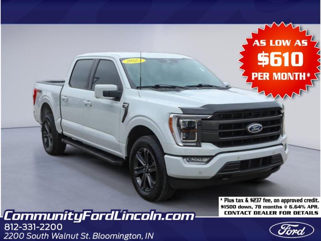 Find exceptional value with this 2023 Ford F-150 LARIAT 4WD, now available in Bloomington, IN. Powered by a robust 3.5L V6 gasoline engine and equipped with four-wheel drive, this truck delivers confident towing, capable off-road performance, and smooth highway cruising. The LARIAT trim elevates comfort and convenience with premium leather seats, heated front seats, and a heated steering wheelâ"perfect for chilly Indiana mornings. Stay connected and hands-free with Bluetooth integration, while remote start ensures the cabin is comfortable before you step inside. The well-appointed interior combines durability and luxury, making this Ford F-150 ideal for both workdays and weekend adventures. Advanced engineering and thoughtful amenities create a driving experience that balances power with refinement. This vehicle is competitively priced and listed as the best price in the area, giving you outstanding value without compromising features or condition. Located in Bloomington, IN, it's ready for immediate test drives and inspections. Whether you need a dependable work truck or a comfortable family hauler, the 2023 Ford F-150 LARIAT 4WD with a 3.5L V6 offers the versatility and performance you're looking for. Contact us to schedule a viewing or test drive and experience why this Ford F-150 LARIAT represents one of the best-priced, feature-rich pickups available in Bloomington today.