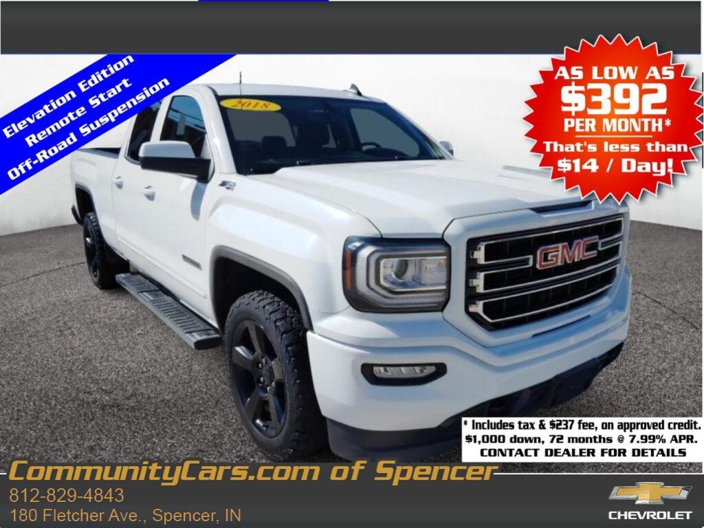 Experience rugged capability and refined comfort with this 2018 GMC Sierra 1500 SLE 4WD, now available in Spencer, IN. Powered by a dependable V8 5.3L gasoline engine, this GMC Sierra delivers confident towing and responsive performance for worksite demands and weekend adventures alike. The SLE trim pairs practical convenience with durable design, while four-wheel drive ensures traction and control across varied road conditions. This GMC Sierra is equipped with a Back-Up Camera for easier parking and safer reversing, plus Steering Wheel Audio Controls for convenient media adjustments without taking your hands off the wheel. Stay connected on the go with Hands-Free Bluetooth and enjoy the comfort of Remote Start on chilly mornings. An Off-Road Package adds capability-enhancing features to help you tackle rough terrain with confidence. The cabin offers versatile storage, comfortable seating, and modern conveniences tailored to daily driving and long hauls. Safety-focused features and the reliable V8 powertrain make this truck a smart choice for drivers needing a capable, dependable pickup. Priced to move, this 2018 GMC Sierra 1500 SLE in Spencer, IN, represents the best price in its class great value for a well-equipped, four-wheel-drive V8 truck. Contact us today to schedule a test drive and see why this GMC Sierra stands out for capability, comfort, and value.