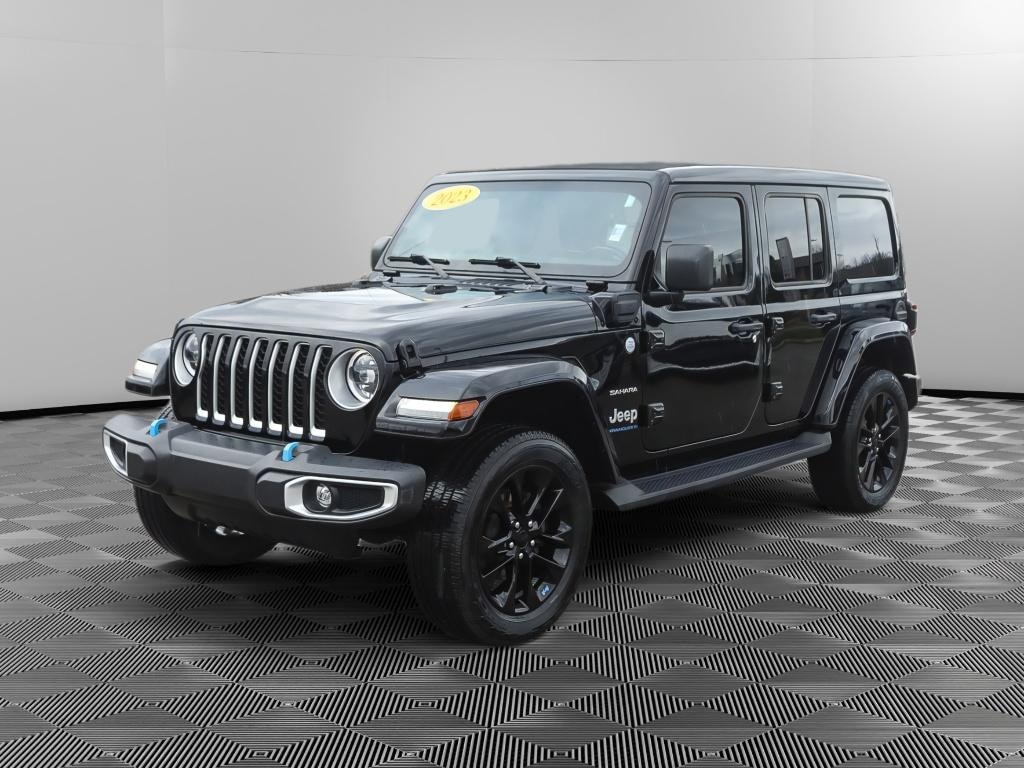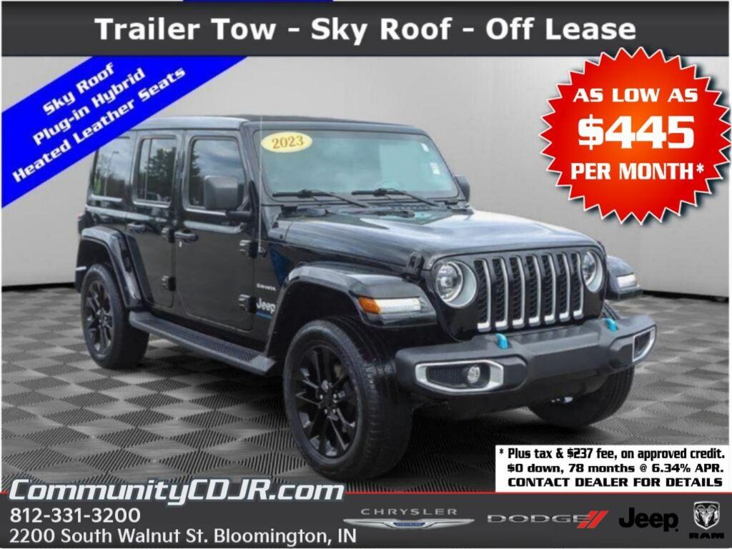 Discover exceptional value with this 2023 Jeep Wrangler 4xe Sahara, a versatile plug-in hybrid SUV located in Bloomington, IN. With only 32,554 miles, this 4WD Sahara pairs a responsive 4-cylinder 2.0L Plug-in Hybrid Electric (PHEV) powertrain with Jeep's legendary off-road capability, delivering efficient performance and electric-assisted torque for confident driving on city streets and rugged trails. This Jeep Wrangler 4xe offers an attractive blend of fuel savings, reduced emissions, and the flexibility of gasoline backup for long trips. Inside, the Sahara cabin is thoughtfully equipped for comfort and convenience. Automatic climate control maintains the perfect temperature, while integrated navigation and Apple CarPlay keep you connected and on course. The back-up camera enhances safety and parking ease, and XM Radio provides entertainment options for every drive. Durable materials and supportive seats ensure comfortable journeys, whether commuting in Bloomington or exploring Indiana's backroads. This 2023 Jeep Wrangler 4xe Sahara is competitively priced and represents the best price in the area for its condition and equipmentâ"an outstanding opportunity for buyers seeking a low-mileage PHEV Jeep with premium features. Located in Bloomington, IN, this Wrangler is ready for immediate test drives. Contact us to schedule a viewing and experience the capability, efficiency, and advanced features of this exceptional Jeep Wrangler 4xe Sahara.